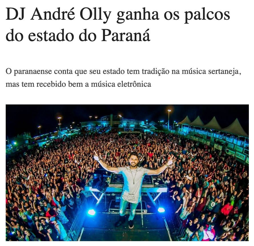 Born in Apucarana, Paraná, André Olly had his first contact with electronic music at the age of 8, influenced by his father. At 13, he started playing at events, refining his techniques and connection with the dance floor. In 2016, he graduated as a producer at AIMEC in Maringá, and since then, he has been incorporating original tracks and remixes into his sets.